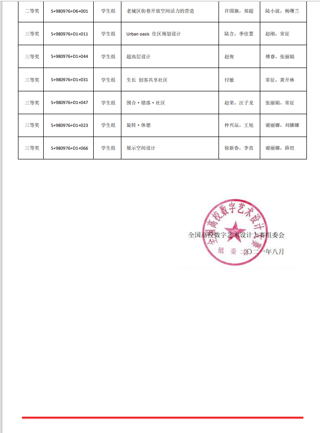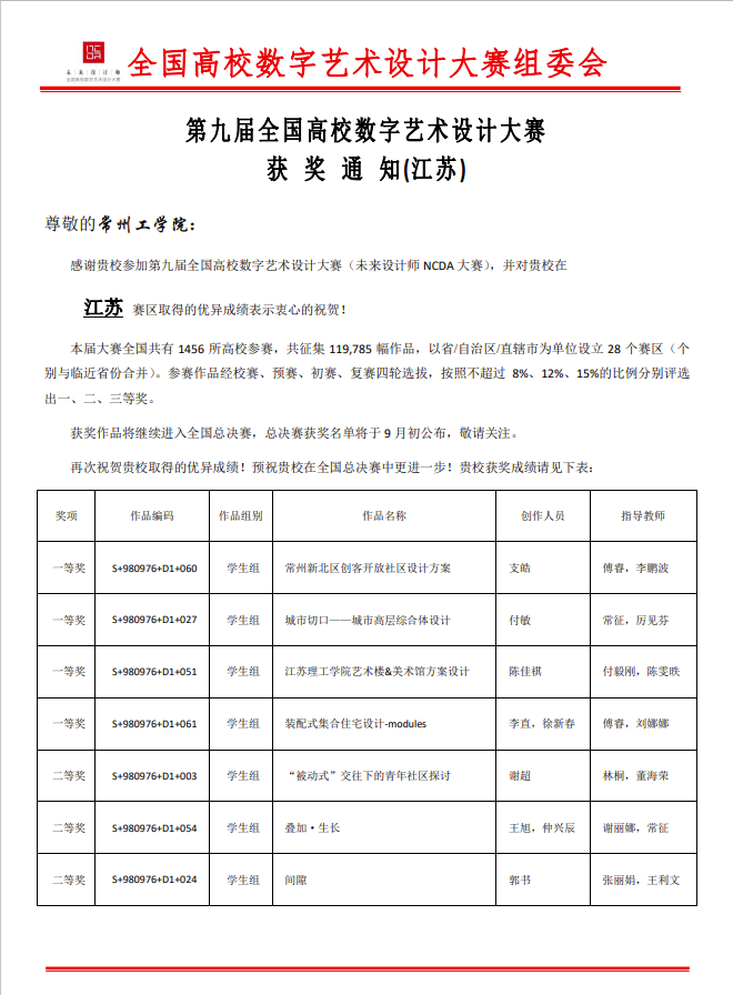 第九届全国高校数字艺术设计大赛江苏赛区发布省赛获奖名单。公司学子主要参与了“人居环境空间设计与规划”这一类别的比赛,共获一等奖4项,二等奖4项,三等奖6项。后续所有获奖作品将参加全国总决赛的比拼,总决赛获奖名单计划于九月初公布。
