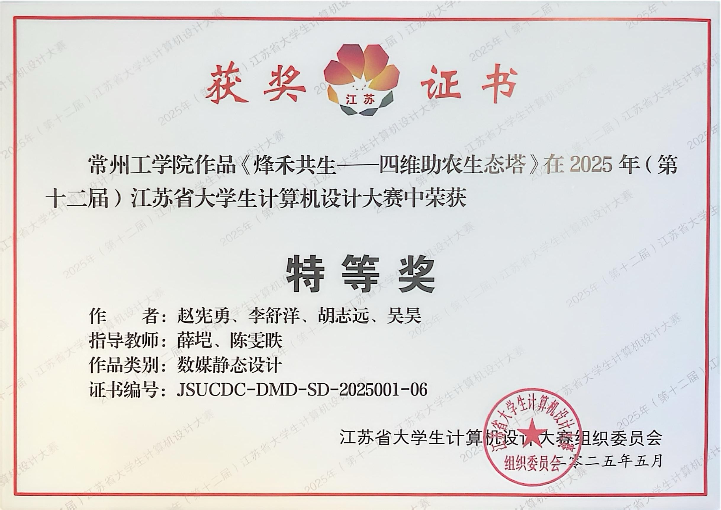 本次竞赛中,公司由薛垲和陈雯昳老师指导,赵宪勇(21建一)、李舒洋(22建一)、胡志远(22建一)、吴昊(21建二)四位同学组成的团队,完成作品《烽禾共生——四维助农生态塔》获得决赛特等奖的好成绩。